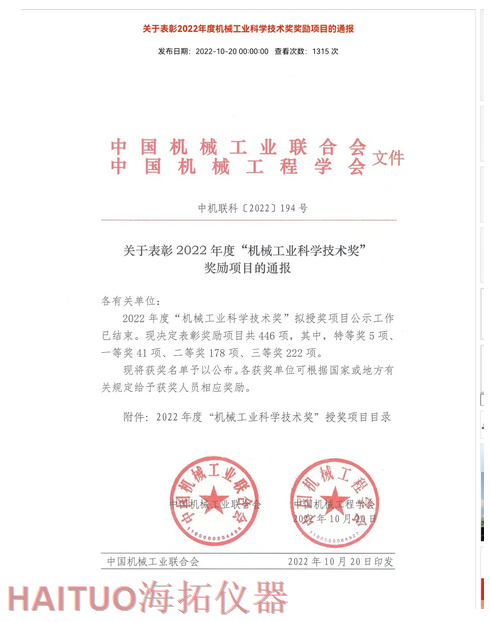 海拓儀器榮獲2022年度中國機(jī)械工業(yè)科學(xué)技術(shù)獎?ICC訊?10月20日,2022年度“中國機(jī)械工業(yè)科學(xué)技術(shù)獎”項(xiàng)目名錄正式發(fā)布,由海拓儀器(江蘇)有限公司完成的“超快速冷熱沖擊試驗(yàn)系統(tǒng)關(guān)鍵技術(shù)研究與系列應(yīng)用”項(xiàng)目榮獲2022年度“中國機(jī)械工業(yè)科學(xué)技術(shù)獎”三等獎。??據(jù)了解,中國機(jī)械工業(yè)科學(xué)技術(shù)獎是根據(jù)《國家科學(xué)技術(shù)獎勵條例》和《社會力量設(shè)立科學(xué)技術(shù)獎管理辦法》的有關(guān)規(guī)定,由中國機(jī)械工業(yè)聯(lián)合會和中國機(jī)械工程學(xué)會共同設(shè)立并經(jīng)國家科學(xué)技術(shù)部批準(zhǔn),在國家科技獎勵主管部門登記的面向全國機(jī)械行業(yè)的綜合性科技獎項(xiàng)。旨在表彰在機(jī)械工業(yè)科技工作中作出突出貢獻(xiàn)的單位和人員,獎勵范圍包括:機(jī)械工業(yè)科學(xué)技術(shù)發(fā)明成果、機(jī)械工業(yè)科學(xué)技術(shù)進(jìn)步成果、機(jī)械工業(yè)工程化和新技術(shù)推廣成果和機(jī)械工業(yè)軟科學(xué)和標(biāo)準(zhǔn)成果。??海拓儀器是一家集研發(fā)、制造、貿(mào)易于一體高科技現(xiàn)代化公司,公司成立于2005年,主要產(chǎn)品包括:超快速冷熱沖擊試驗(yàn)機(jī)(熱流儀)、快速溫變應(yīng)力篩選試驗(yàn)箱(ESS), -
